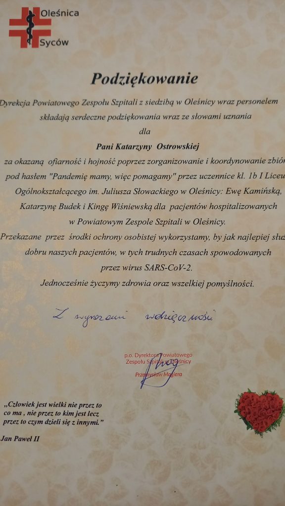 Dyrekcja Powiatowego Zespołu Szpitali z siedzibą w Oleśnicy wraz personelem składają serdeczne podziękowania wraz ze słowami uznania za okazaną ofiarność i hojność poprzez zorganizowania zbiórki pod hasłem „Pandemię mamy, więc pomagamy” przez uczennice kl. 1b I Liceum Ogólnokształcącego im. Juliusza Słowackiego w Oleśnicy: Ewę Kamińską, Katarzynę Budek i Kingę Wiśniewską pod koordynacją Pani Katarzyny Ostrowskiej dla pacjentów hospitalizowanych w Powiatowym Zespole Szpitali w Oleśnicy. Przekazane przez środki ochrony osobistej wykorzystamy, by jak najlepiej służyły dobru naszych pacjentów, w tych trudnych czasach spowodowanych przez wirus SARS-CoV-2.