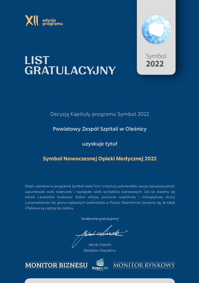 Z ogromną przyjemnością pragniemy poinformować, że Powiatowy Zespół Szpitali w Oleśnicy otrzymał tytuł Symbolu Nowoczesnej Opieki Medycznej 2022.