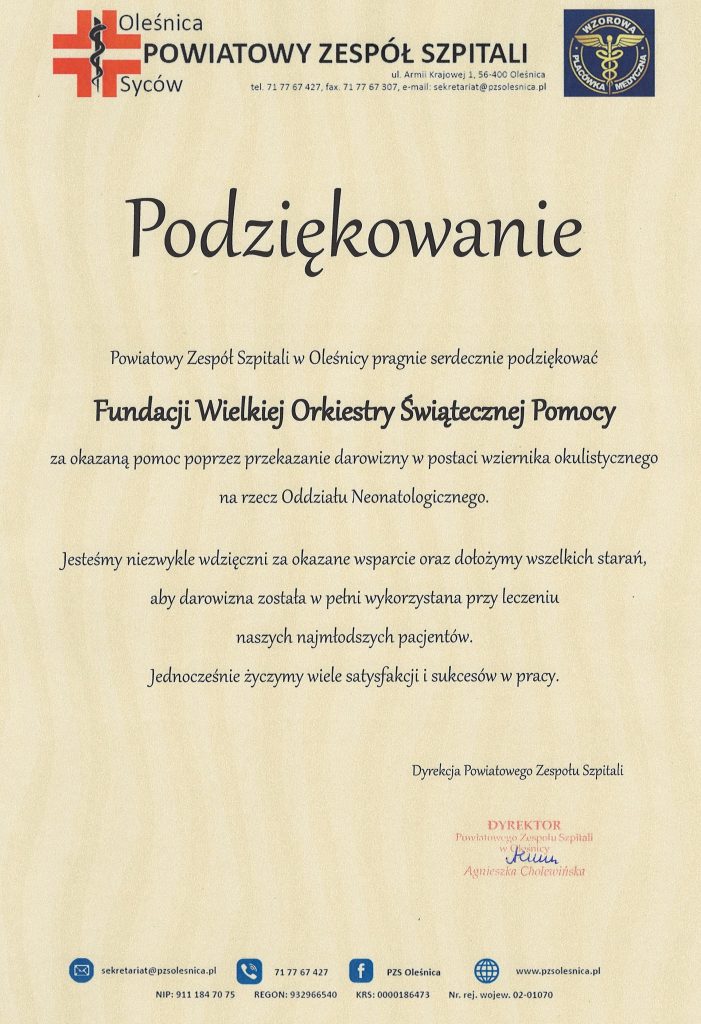 Oddział Neonatologii otrzymał dar od Fundacji Wielkiej Orkiestry Świątecznej Pomocy – wziernik pośredni z soczewkami. Sprzęt ten będzie wykorzystywany do bardzo dokładnej diagnostyki w kierunku retinopatii wcześniaczej u najmniejszych pacjentów. Urządzenie jest wykonane z wysokiej jakości materiałów, zawiera bezobsługową i pyłoszczelną optykę, a wyświetlany obraz 3D dna oka jest wyjątkowo ostry i wyraźny.