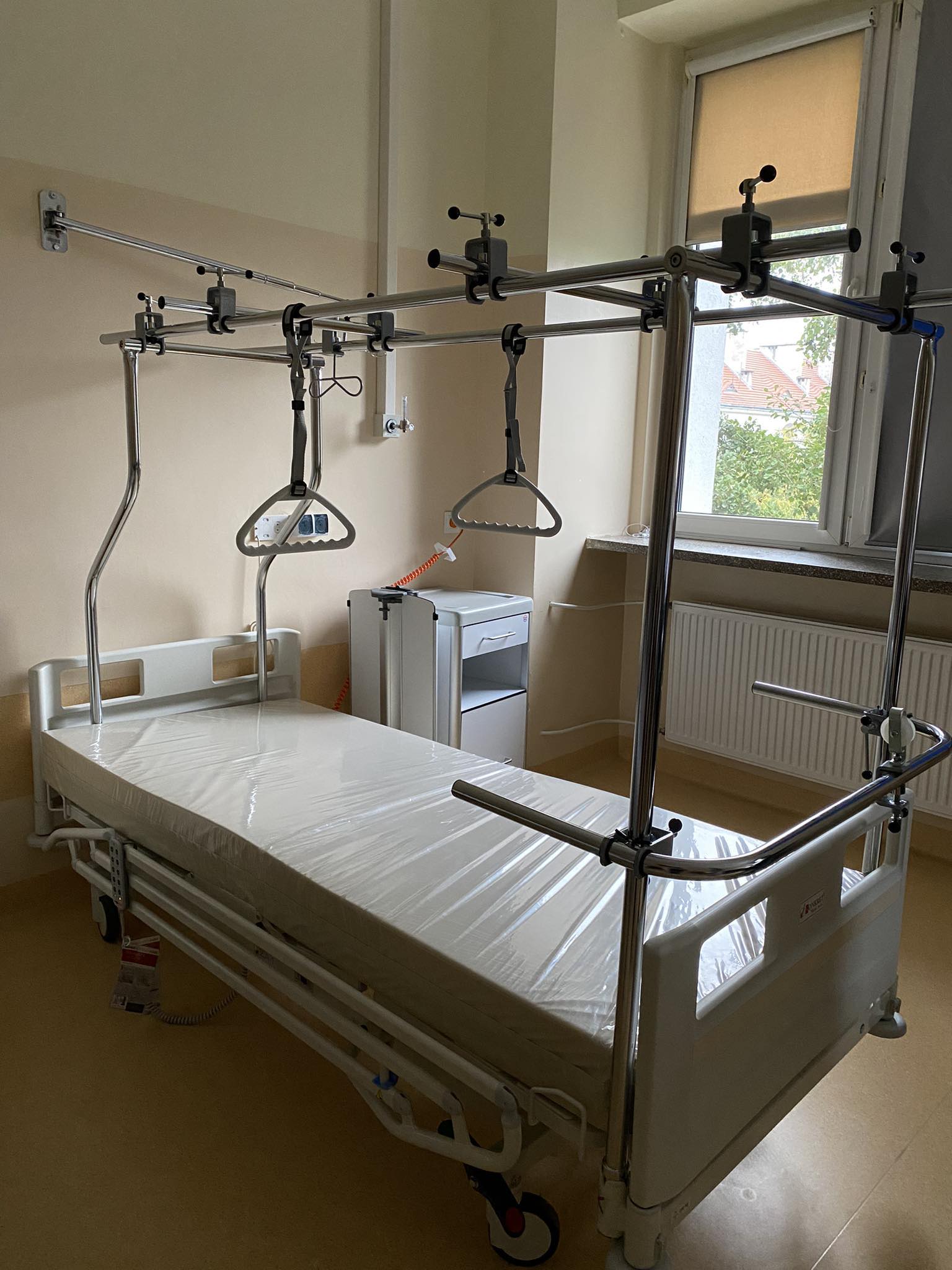 Nasz Oddział Chirurgii Ogólnej został doposażony w łóżko ortopedyczne ,które posiada ramy ortopedyczne, wysięgniki oraz materac przeciwodleżynowy. Łóżko będzie służyło w szczególności pacjentom wymagającym opieki po urazach czy operacjach, a także umożliwi personelowi medycznemu zapewniającemu opiekę chorym wykonywania rutynowych i specjalistycznych czynności w ramach hospitalizacji pacjenta.