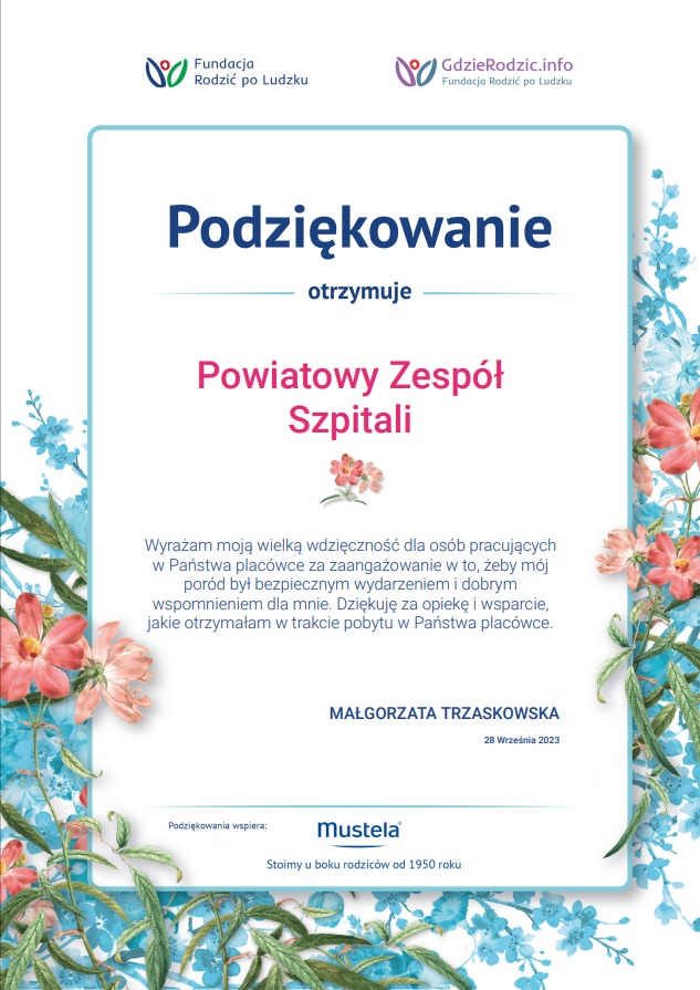 Z wielką radością informujemy, że Powiatowy Zespół Szpitali w Oleśnicy wraz z położnymi Beatą Kostusik i Katarzyną Malec za pośrednictwem portalu Gdzierodzic.info otrzymali podziękowania od pacjentek za zaangażowanie w bezpieczny poród, otrzymaną opiekę i wsparcie podczas pobytu w naszej placówce.