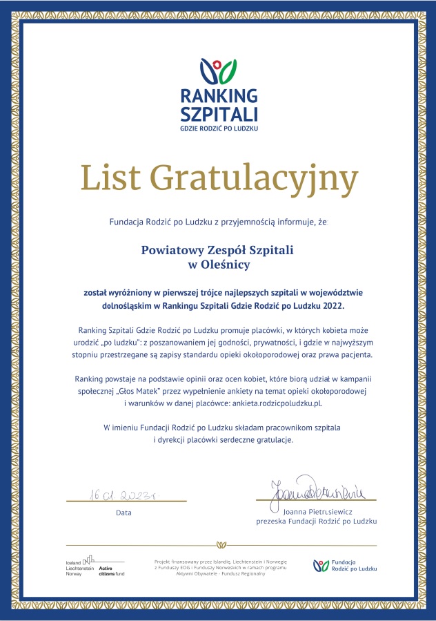 z przyjemnością informujemy, że Powiatowy Zespół Szpitali w Oleśnicy znalazł się wśród najlepszych szpitali położniczych w województwie dolnośląskim w Rankingu Szpitali Gdzie Rodzić po Ludzku w 2022 roku.