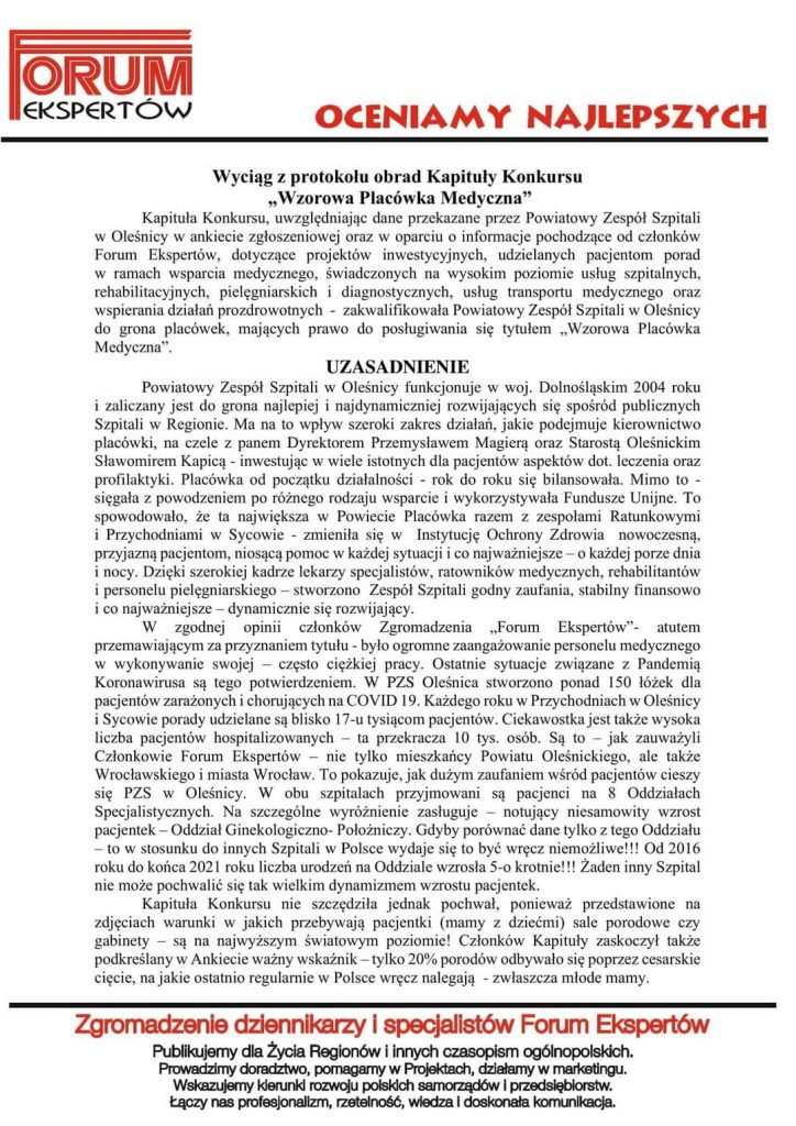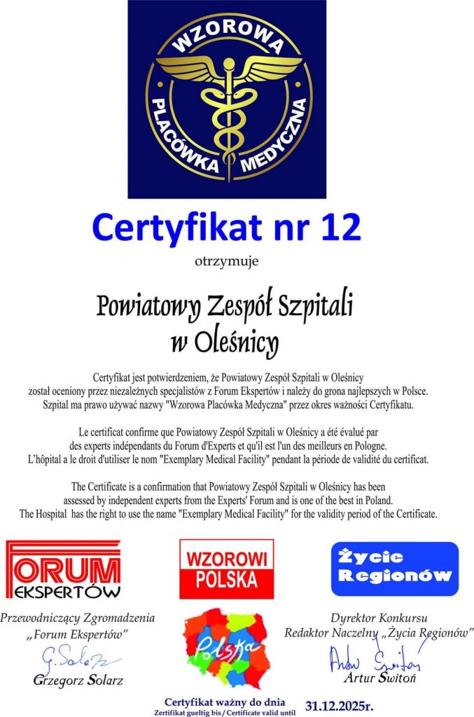 Powiatowy Zespół Szpitali z siedzibą w Oleśnicy na podstawie decyzji Forum Ekspertów został nominowany do ubiegania się o nagrodę w ogólnopolskim Konkursie „Wzorowa Placówka Medyczna”.